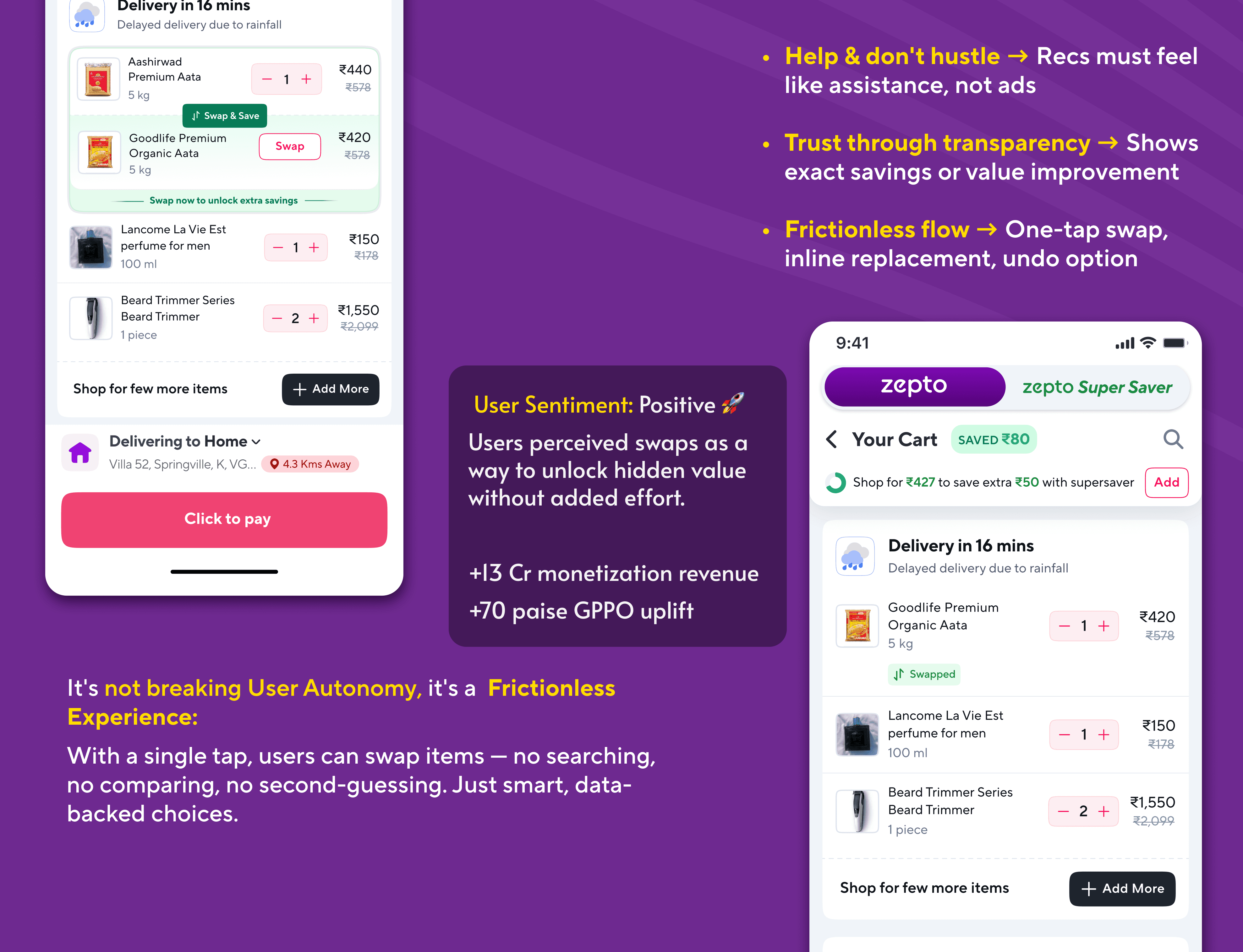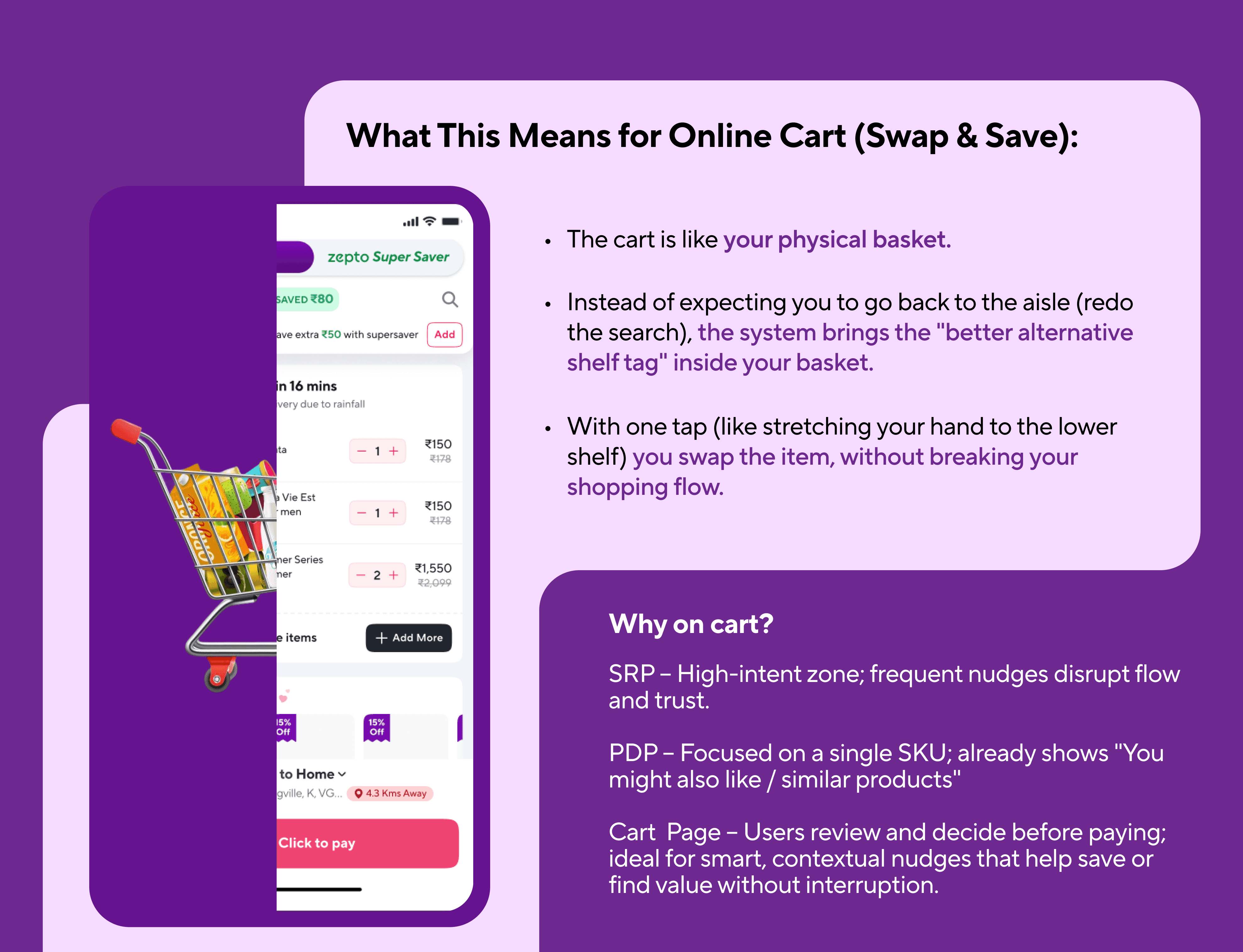 Reimagining the cart as a decision-support surface, surfacing contextual recommendations that help users save money or make smarter choices.